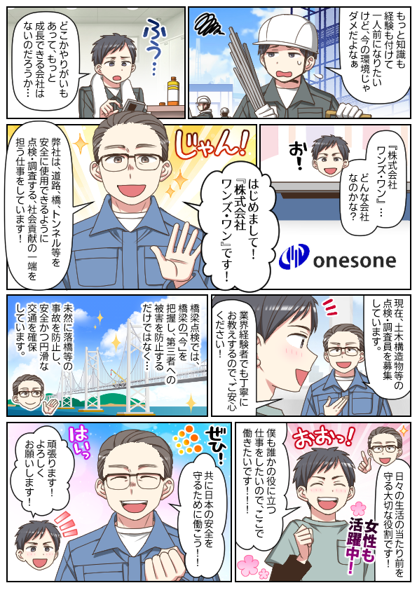 現在、土木インフラの点検や整備に関するニーズは高く、全国から依頼が寄せられている状況です。今後も多くのお客様の期待に応えるためにも、組織体制の強化が欠かせません。そこで今回、一緒に会社を盛り上げていただく新たなメンバーを採用することになりました。